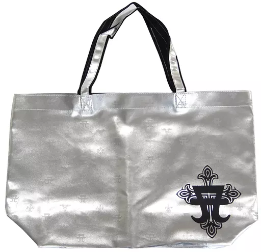 This large size bag with cross and A mark monogram designed all over the silver fabric has an elegant finish.