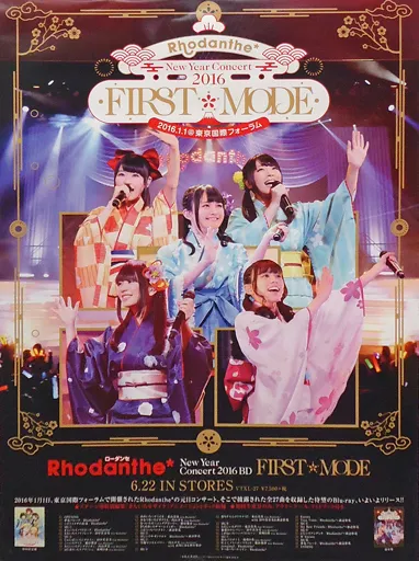 This is a promotional poster for the LIVE Blu-ray "New Year Concert 2016 FIRST * MODE" by Rhodanthe *, a voice actor unit born from TV anime 『 Kin-iro Mosaic 』.