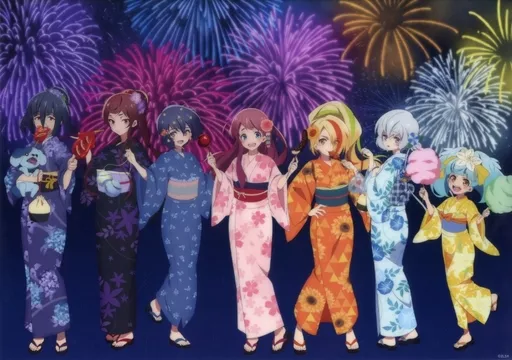Franschsh in Yukata is made into a clear poster with colorful fireworks.