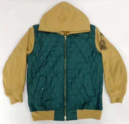 This is a big size parka that combines moss green quilting and camel sweat with different materials.