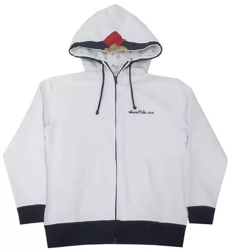 A white hooded parka with Miku's costume design. There is an illustration by Yasumo printed on the back.