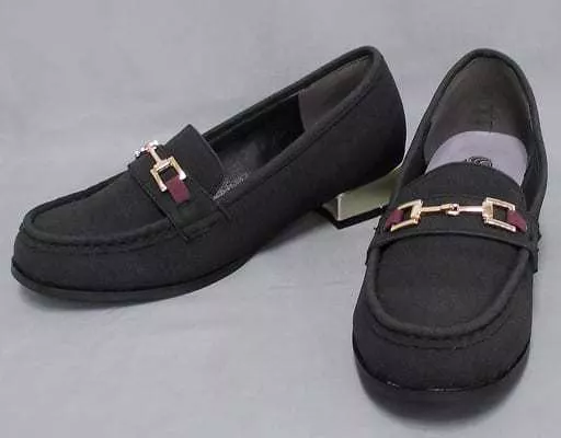 Product explanation ■ Loafer pumps accented with gold metal parts on a black base.