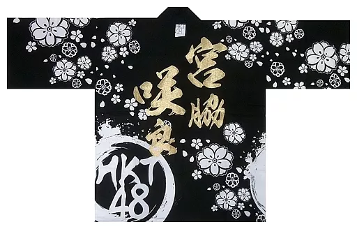 This is a happi with a white cherry blossom pattern on a black fabric and a member name embroidered in gold on the back.