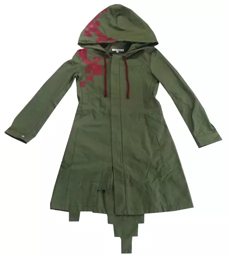 Details such as slim silhouette, large hood, and uneven hem shape are reproduced according to the set design.