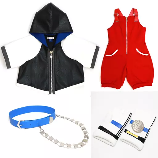 This is a 4-piece set of a hood jacket, all-in-one, belt with chain, and gloves.