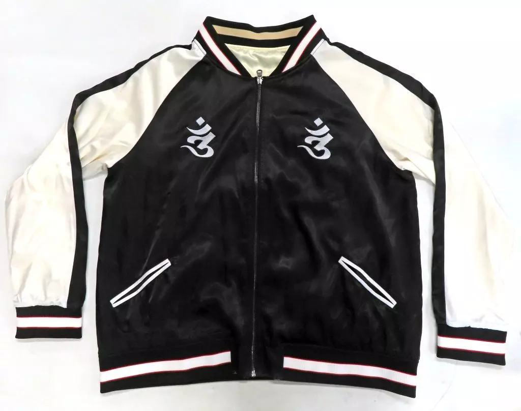 This is a reversible scad jacket with impressive embroidery of Divine Spirit Satan (Shin Megami Tensei II) on the LAW side and God of Destruction Asselah (Shin Megami Tensei) on the CHAOS side. It can be worn according to your mood and belief of the day.