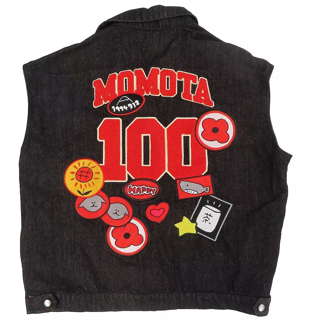 The back side features an embroidered emblem with a Momota "100" and an illustration drawn by Momota.