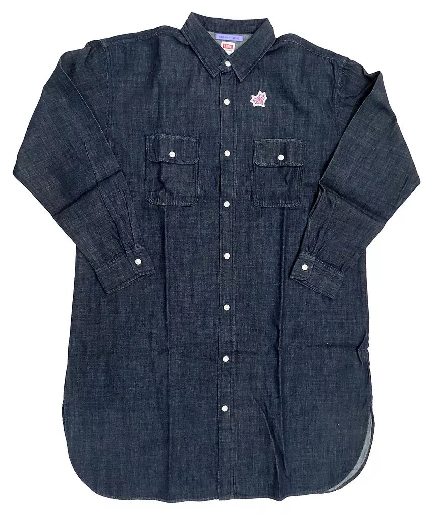 A long denim shirt with a heart shaped spider web motif that peeks into the breast as an accent.