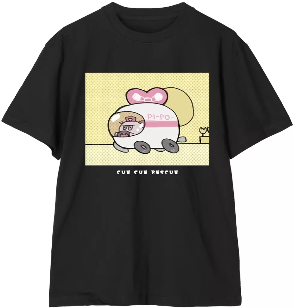 The illustration of "CUE CUE RESCUE CUE" is made into a T-shirt.