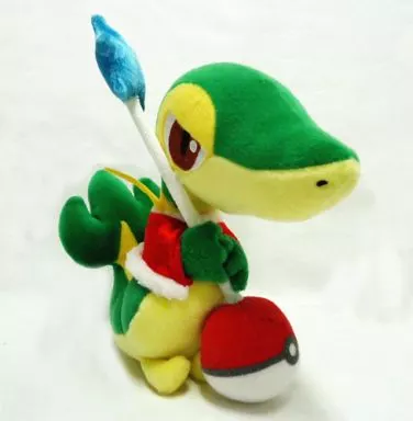 This is a Snivy Plush toy with a stick with a star and a monster ball on the tip.