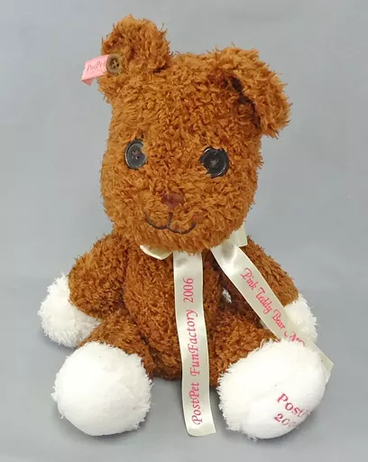 The ribbon at the neck is designed with the words "PostPet Teddy Bear MOMO" and "Pink Teddy FunFactory 2006".