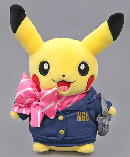 A Pikachu in a CA outfit with a perfect pink ribbon.