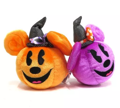 This is a cute Plush toy badge with a pumpkin shaped Mickey and minnie wearing a witch's cap.