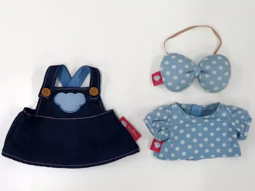This is a costume set with white dot pattern T-shirt on blue fabric, ribbon and denim jumper skirt.