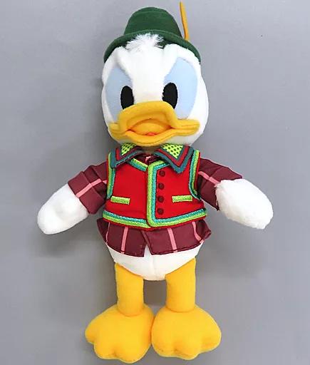 Donald has a red vest style coordination and a green feather hat!