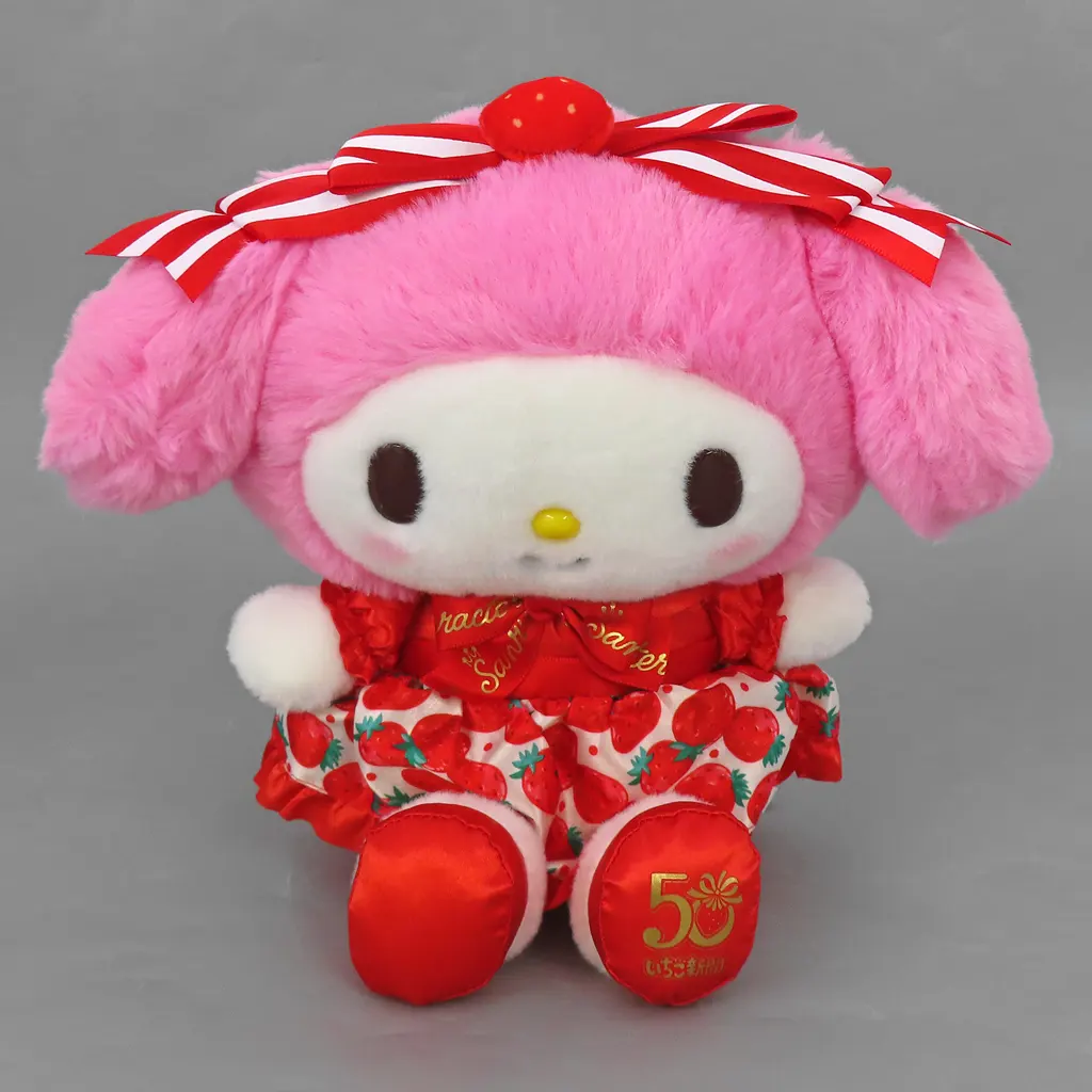 商品解説■ふわふわでやわらかい手触りのぬいぐるみ。いちご柄のお洋服やいちごのリボン、帽子がポイントだよ♪足裏には、いちご新聞50周年マークのロゴ入り!【商品詳細】サイズ:全高約24cm