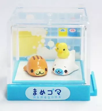The toy is a water tank case with the image of "プチリウム" and contains 2 cute Mame Goma figurines.