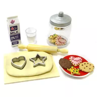 8 cookies, cookie dough, mold (star), mold (heart), cutting board, rolling pin, milk, cup, bottle, plate