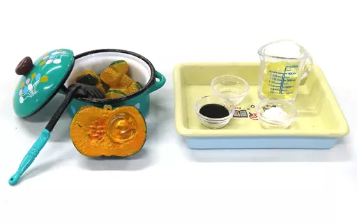 Pumpkin (large), 3 containers for seasonings, 3 seasonings (sugar, mirin, soy sauce), tray,
