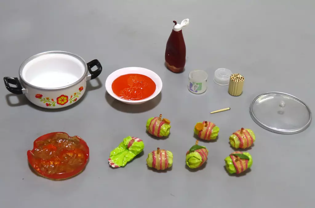 Pots, pot lids, 4 Stuffed Cabbage Rolls (pots), 2 Stuffed Cabbage Rolls (plates), Stuffed Cabbage Rolls (in the middle of wrapping), toothpick, ketchup