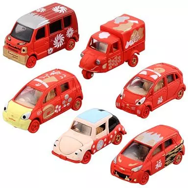 Assorted 6 kinds of red tomica with motifs of engimono such as Fukusuke, Shishi and Manekineko.