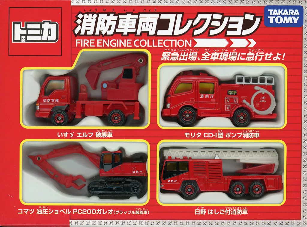 Set Contents : Komatsu Hydraulic Excavator PC200 Galeo, Hino Hashigo-equipped Fire Engine, Isuzu Elf Destruction Vehicle, Morita Holdings CD-Type Pump Fire Engine