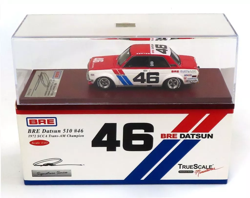 Product Description ■ BRE Datsun 510 #46 1972SCCA Trans-AM Champion (red x white) is now available in a 1/43 scale display model.