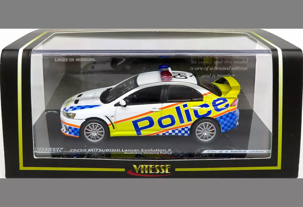 Product Description ■ Mitsubishi Lancer Evolution X Australia Victoria Police (white x yellow x blue) is now available in a 1/43 scale display model.