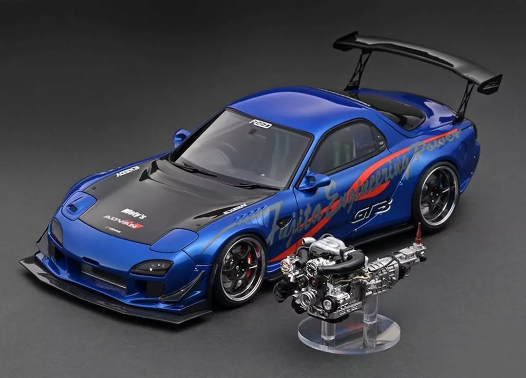 Product Description ■ FEED Afflux GT3 (FD3S) is reproduced with 1/18 scale resin materials. ADVAN R6 type 18 inch wheels (polished & gunmetallic) and low down specifications.