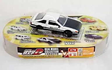 There is a line up of Takumi Fujiwara AE86 TRUENO (white x black) in "INITIAL D REAL MODEL COLLECTION public road fastest legend edition".