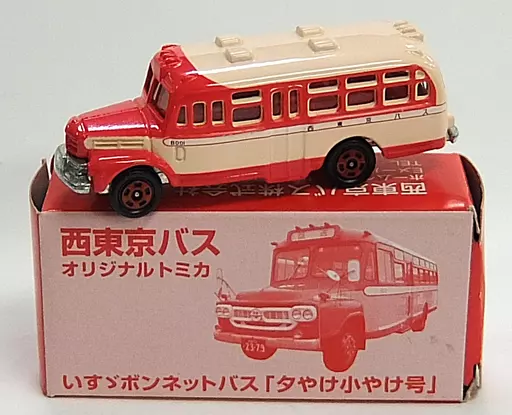 This is Nishi Tokyo Bus Original Tomica, 1/110 Isuzu bonnet bus Yuyake-Koyake (red x beige).