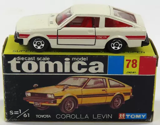 Product explanation ■ "Tomica" and 1/61 TOYOTA COROLLA LEVIN (beige x red) line up.