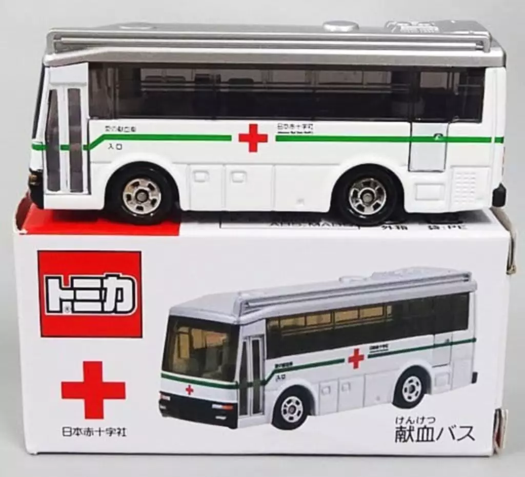 The Tomica is lined up with 1/81 Japanese Red Cross Blood Donation Bus (white x silver).