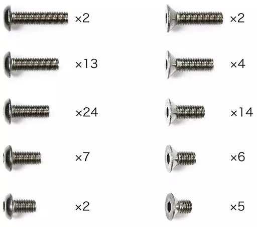 3 x 10 mm hexagonal titanium countersunk screws (13 pcs), 3 x 5 mm hexagonal titanium countersunk screws (5 pcs), 3 x 6 mm hexagonal titanium countersunk screws (6 pcs),