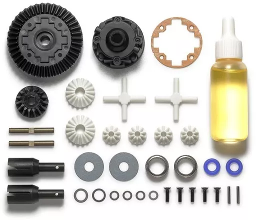 スチール製デフジョイント、ギヤデフ用リングギヤ(39T)、ベベルピニオンギヤ(39T用)、デフケース、1280ベアリングなどをセット