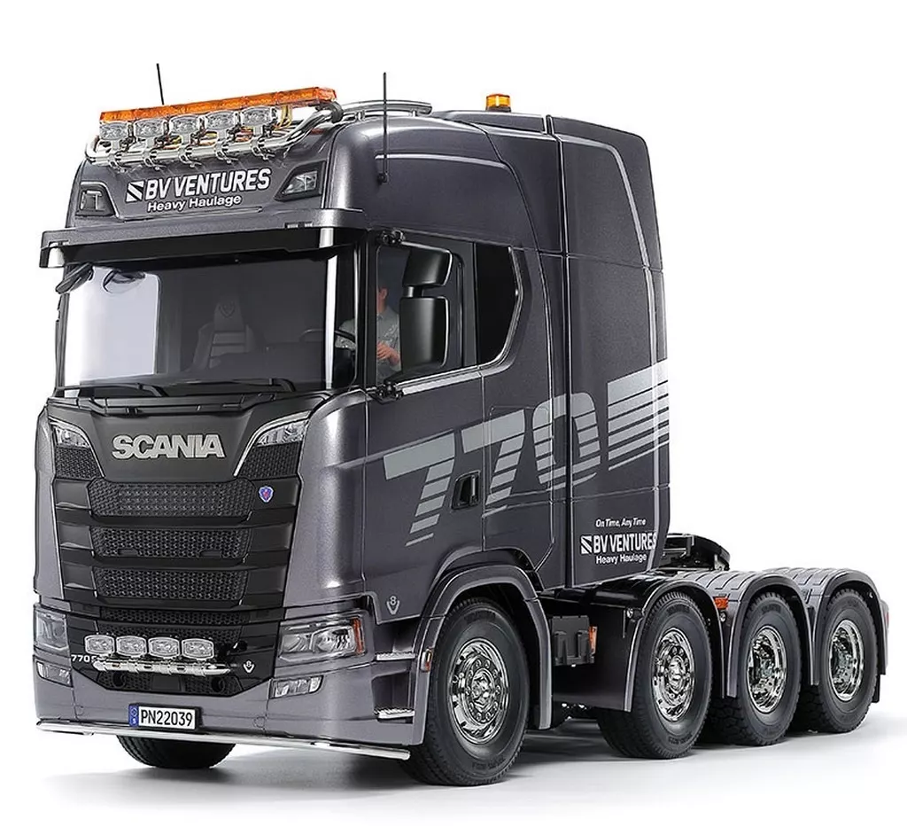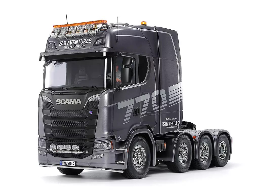 The company's new generation model is the highest grade of the company's S series. It is equipped with a 16.4 liter V8 diesel turbo engine with 770 horsepower that was added in 2020 to the S series. It is equipped with an 8-wheel heavy trailer head with front 2-axis steering and rear 2-axis drive. The Scania 770 s 8 x 4/4 electric RC car assembly kit.
