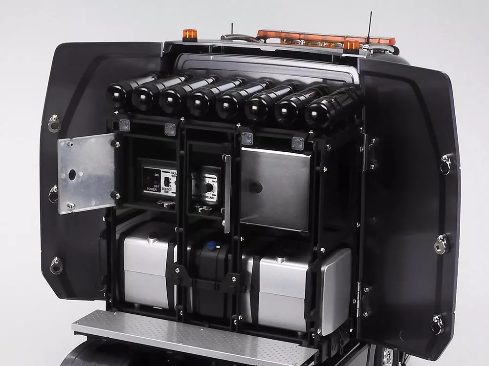 Starting with the cab, all body related parts such as the front bumper, front fender and roof are painted with gun metal. The surfaces are protected with a clear top coat.