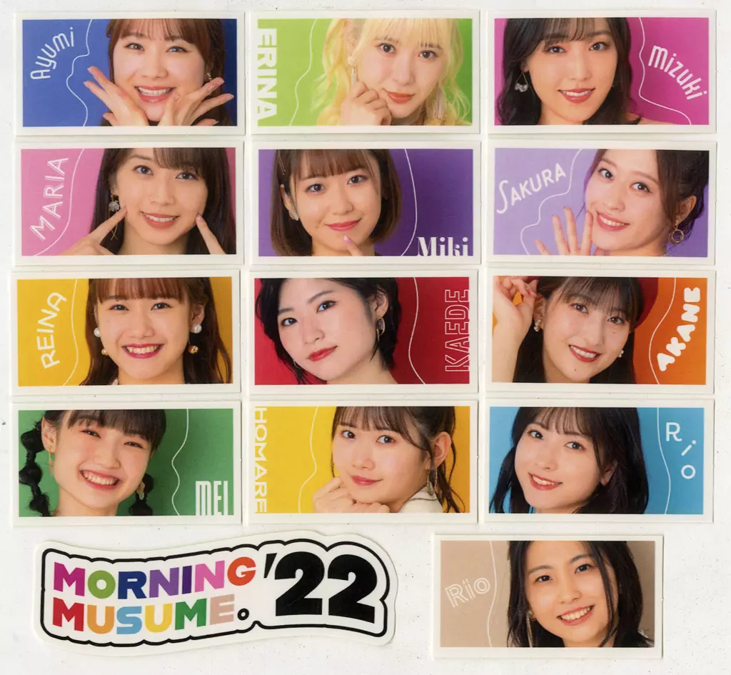 メンバーの顔写真ステッカー13枚と、MORNING MUSUME。’22 ロゴステッカー1枚のセット