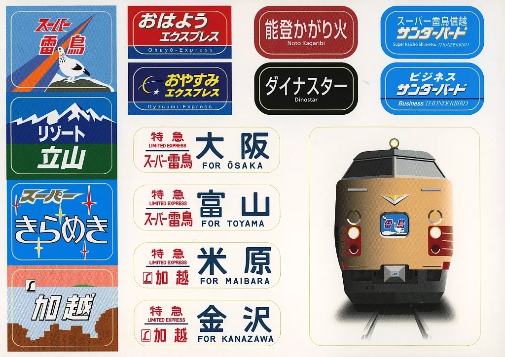 商品解説■おはよう・おやすみエクスプレスやのスーパー雷鳥信越サンダーバードの種別幕、スーパー雷鳥・加越の行先表示幕やヘッドマークなどをステッカーにしました。【商品詳細】サイズ:約15×21cm