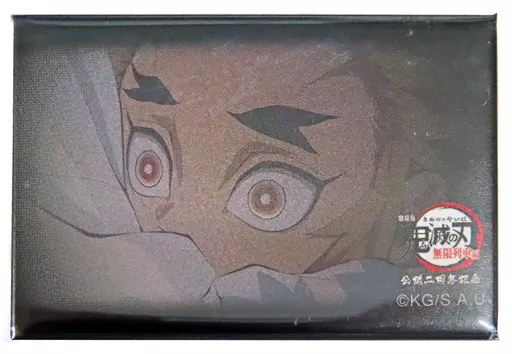 It is "Demon Slayer: Kimetsu no Yaiba' 119 no Kotoba' Random Square metal badge E" of "Kyojuro Rengoku Mugen Train 2nd anniversary of opening".