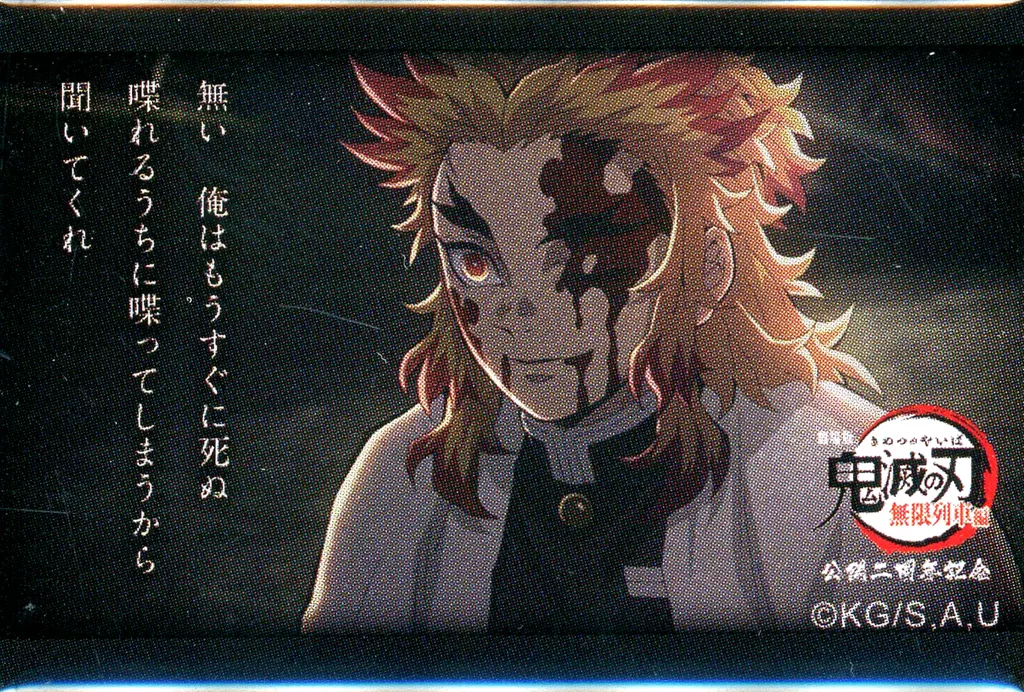 Badge Pins No, I'm gonna die soon. I'm gonna talk as much as I can, so listen to me. "The second anniversary of the release of the Demon Slayer: Kimetsu no Yaiba Infinite Train, Kyojuro Rengoku" 119 Lines "Random Square metal badge F."