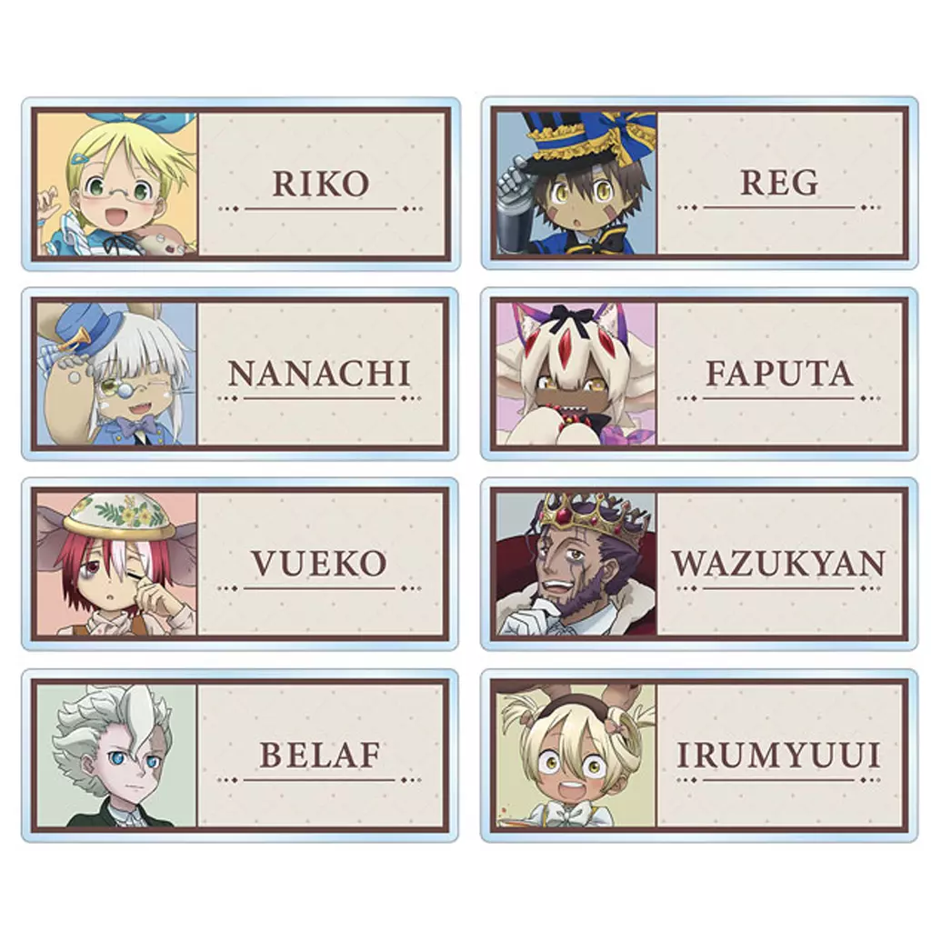 Merchandise Description ■ Trading of "MADE IN ABYSS's Golden Village Animate Fair" goods Acrylic name plate set of 8 kinds.