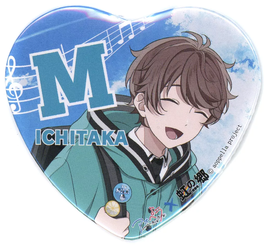 This is a heart-shaped metal badge for "Aopera -aoppella? - x Nijinosato" goods.