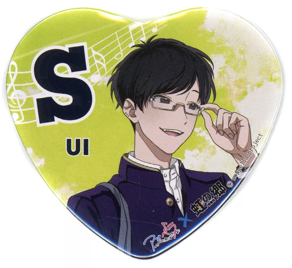 This is a heart-shaped metal badge for "Aopera -aoppella? - x Nijinosato" goods.