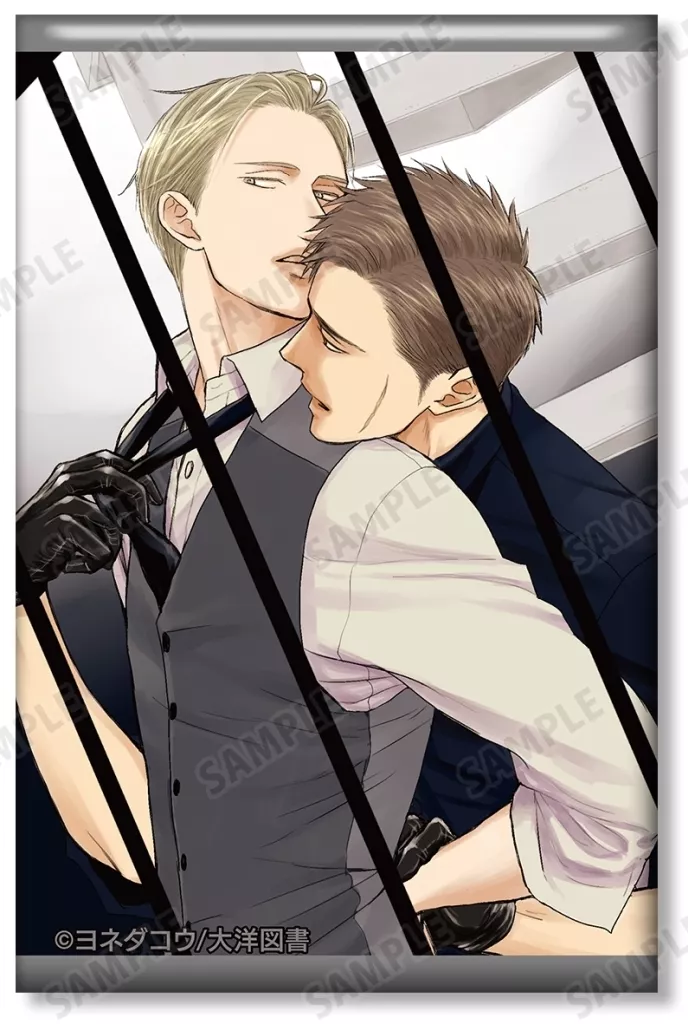 The illustration of Yashiro and Domeki is made into a square metal badge.