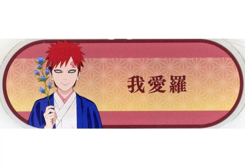 Japanese title: バッジ・ビンズ 我愛羅(楕円) 「NARUTO-ナルト- 疾風伝 うちはサスケ バースデーフェア in アニメイト 描き下ろし トレーディングアクリルネームプレート <うちはサスケ バースデーver.>」