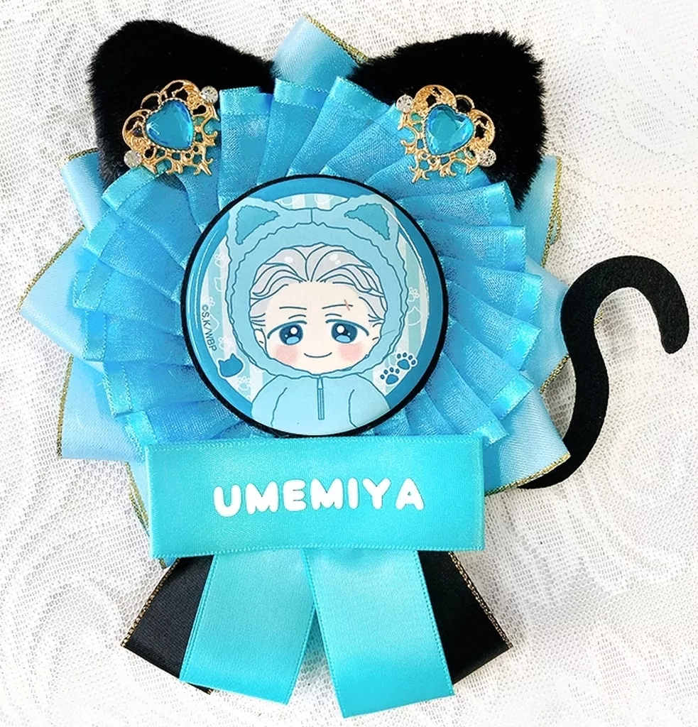 It is a set of a name rosette with fluffy cat ears and a 57 mm metal badge with a deformed illustration.