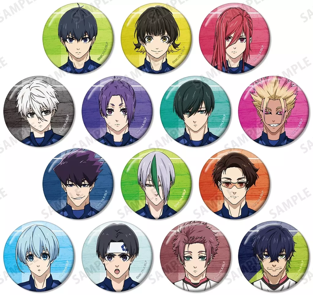 The metal badge is decorated with illustrations of Seiichi Kiyoshi, Hachirakumai, Sengiri Hyoma, Seishiro calm sea, Reo Mikage, Rin Itoshi, Ryusei Shido, Utabito, Kageta 乙夜, Ken Yu Yukimiya, Hitsuji Sheep, Eiro Nanaboshi, Sae Itoshi, Ken Yu Yukimiya, 氷織 Sheep, Eiro Nanaboshi, Sae Itoshi, and Ken Yu Yukimiya.
