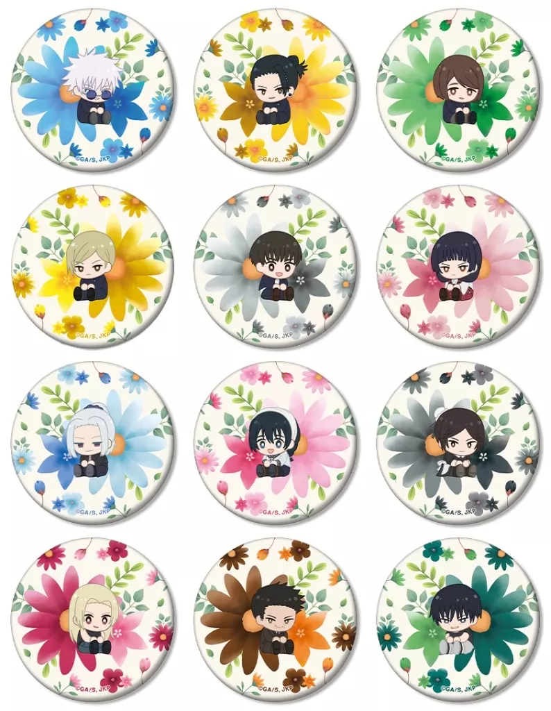 The illustrations by Satoru Gojo, Kanyu Ketsu, Ieiri Glass, Tateto Shitsumi, O Haibara, Princess An, 冥冥, Riko Amanai, Misato Kuroi, Yuki Kutsukuru, Ko Shigu, and Jinni Fushiguro have been incorporated into a botanical design and newly created with a delicate touch to create a matte touch metal badge.