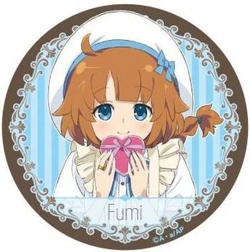 カフェ店員さん衣装でプレゼントを渡すイメージの描き下ろしイラストを使用した缶バッジです。